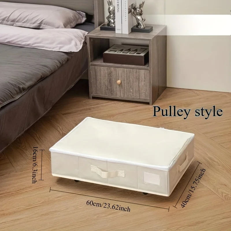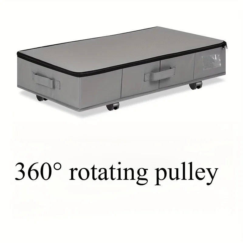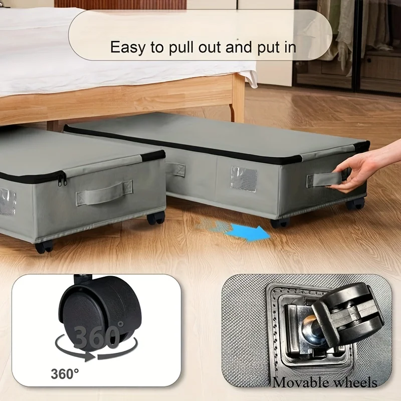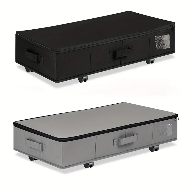 Cette boîte facilite la rotation des vêtements au fil des saisons. En outre, son format rectangulaire s’intègre naturellement sous la majorité des lits et armoires, ce qui optimise la place disponible. Avec ses roues détachables à 360°, elle se déplace aisément, même lorsqu’elle est remplie. De plus, les roues peuvent être retirées pour une installation fixe.