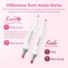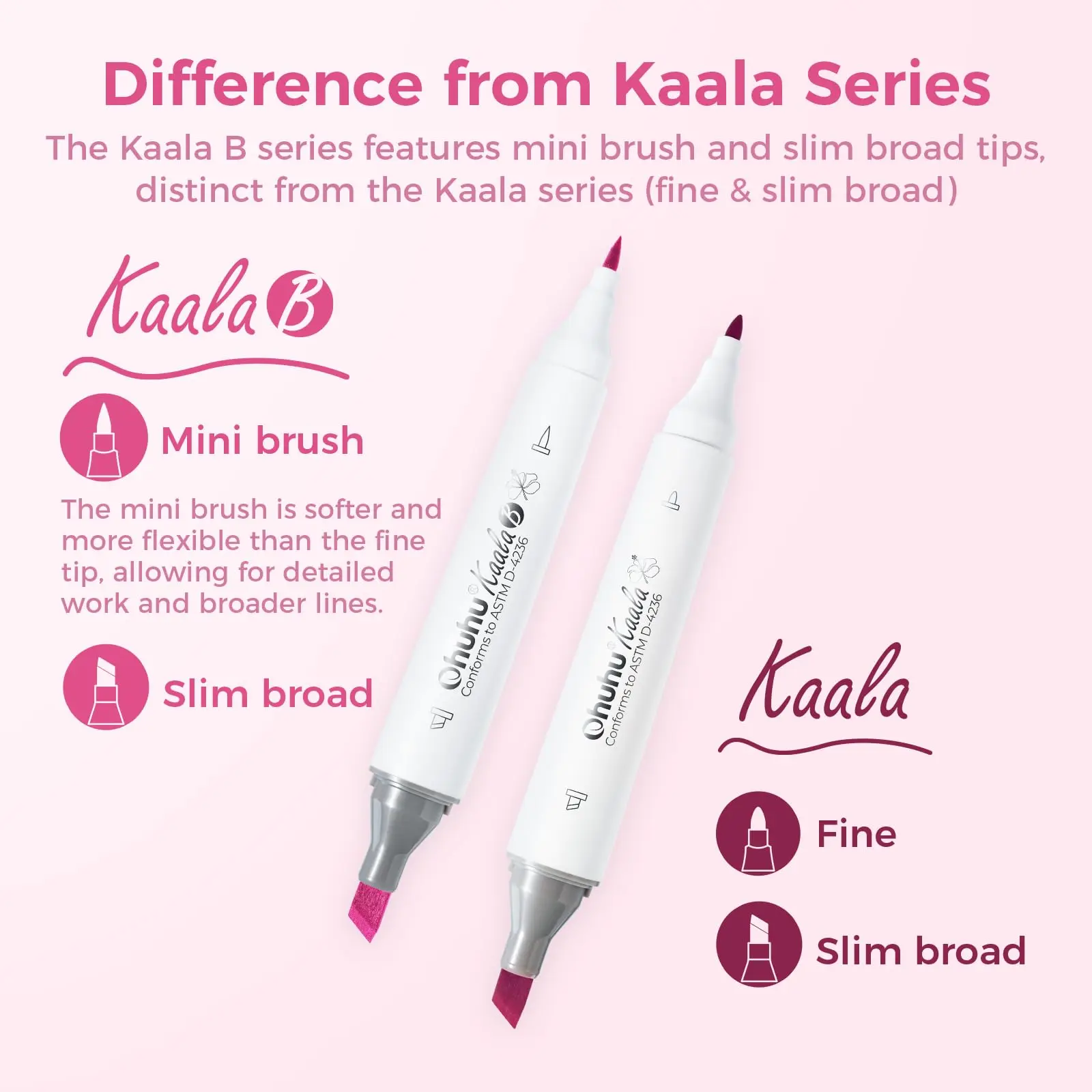 La série Kaala B se distingue par ses doubles pointes mini pinceau (1-4 mm) très précises et sa pointe large fine (1-6 mm). La mini pinceau permet des détails précis, calligraphie et couverture rapide de grandes zones. La pointe large fine offre un contrôle optimal pour des lignes fines et précises, idéale pour des remplissages rapides et précis.
